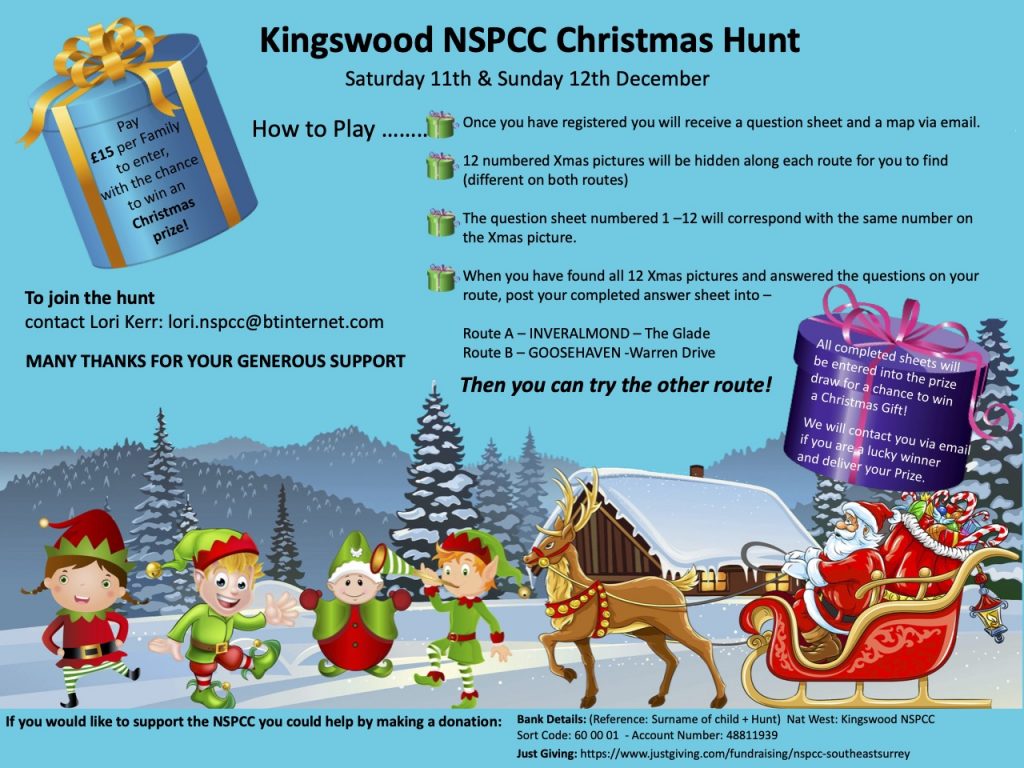 Kingswood NSPCC invite all intrepid Christmas hunters to take part in our Christmas hunt on Saturday 11th and Sunday 12th December. £15 per family. Chance to win a Christmas prize. All details on how to book on below poster. Come along and help us raise much needed funds for the NSPCC.