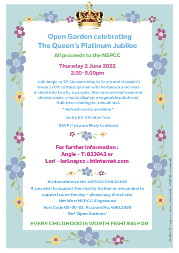 Kingswood NSPCC invites you to visit an open garden on Thursday 2nd June from 2pm to 5pm in Shelvers Way to celebrate The Queen’s Platinum Jubilee. Come along and enjoy a cup of tea and cake whilst strolling through the delightful garden. For further information please contact Lori Kerr PLEASE NOTE – Due to roadworks […]